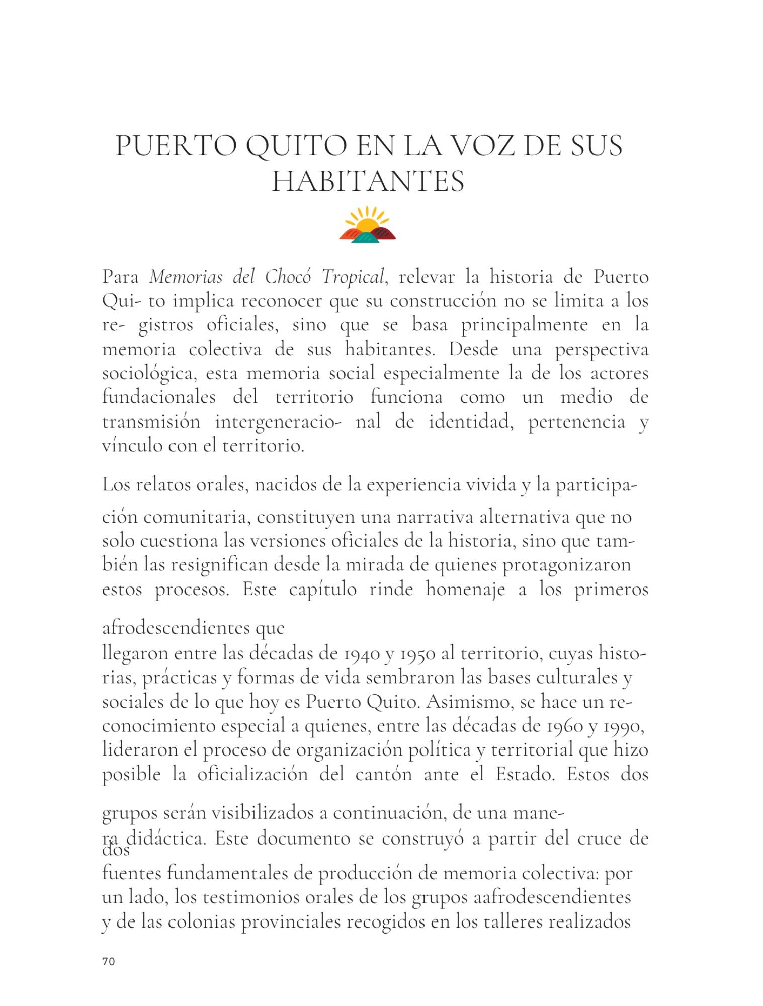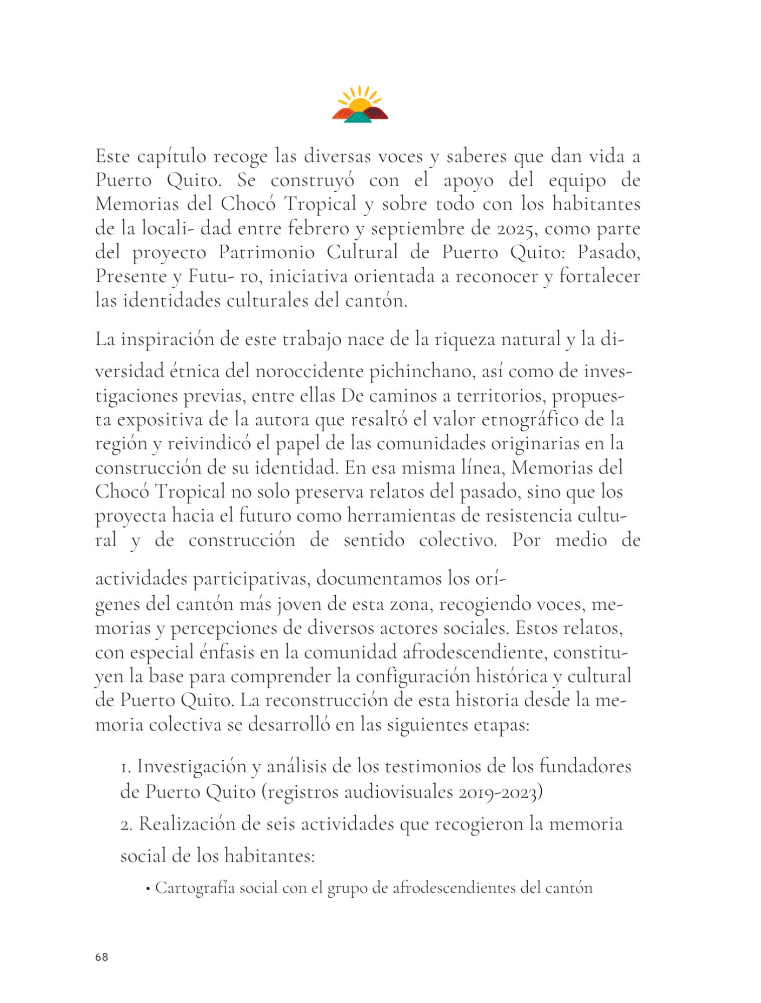 Puerto Quito guarda la memoria de los pueblos yumbos, la fuerza afrodescendiente y la diversidad cultural que dio forma a este territorio único. Este libro te invita a recorrer su historia, descubrir sus tradiciones y maravillarte con su biodiversidad, una de las más ricas del planeta. Más que páginas, es un viaje: un encuentro con la memoria viva de sus habitantes y una apuesta por un futuro sostenible en el corazón del Chocó ecuatoriano.